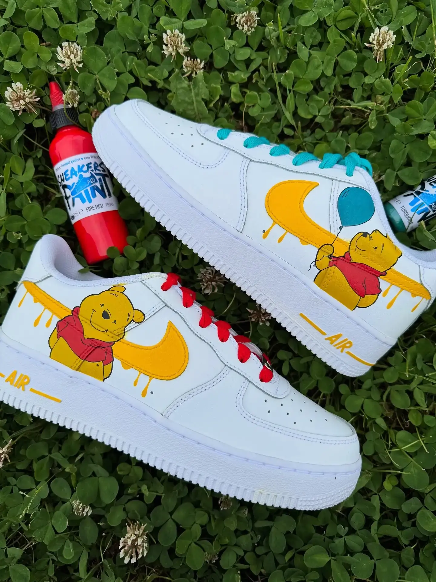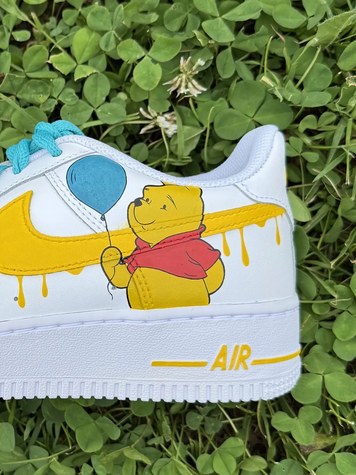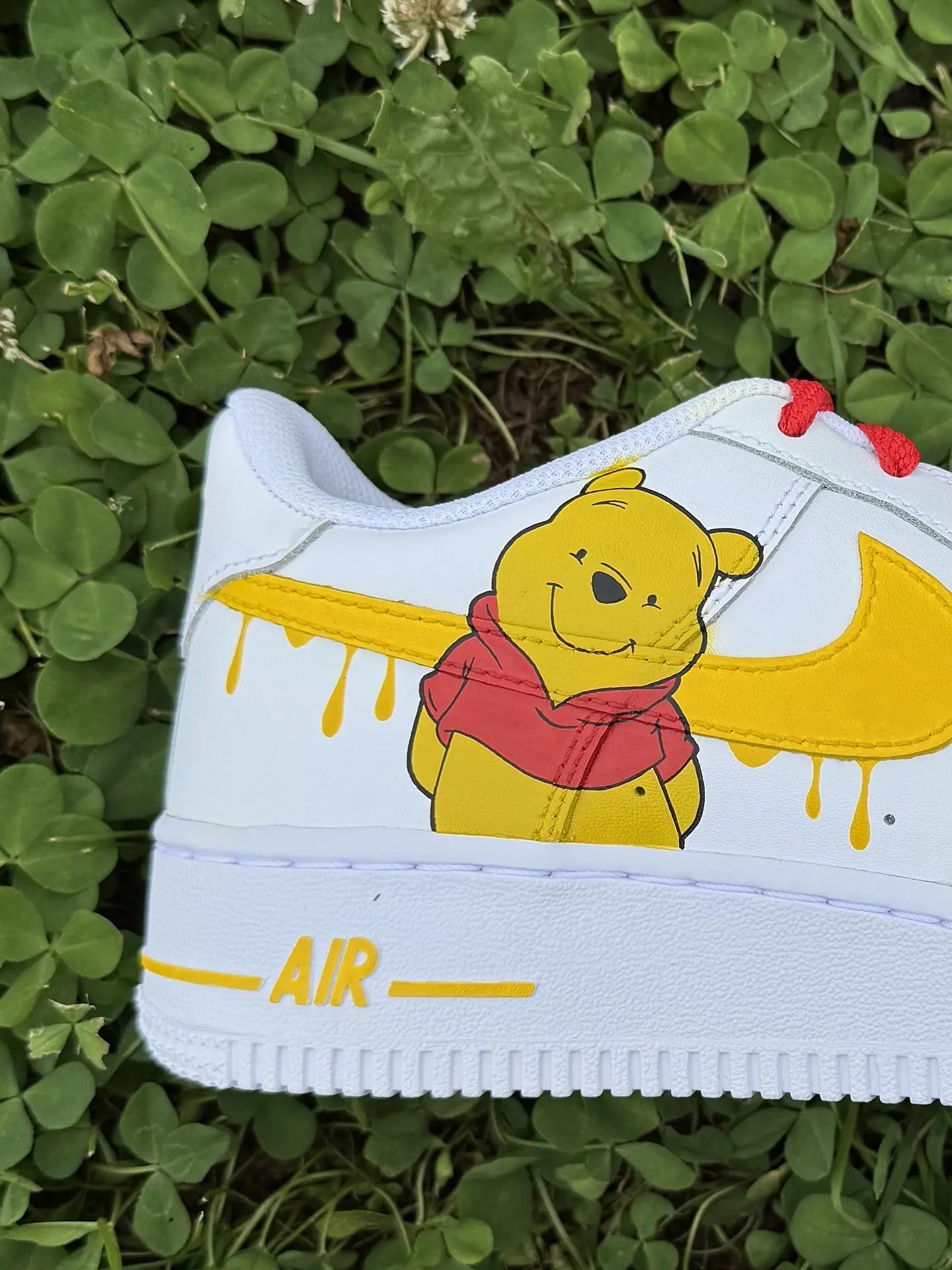 Make every step nostalgic with these custom Winnie the Pooh Air Force 1s! Featuring your favorite honey-loving bear and a playful dripping swoosh design, these sneakers are hand-painted with precision and sealed for long-lasting wear.